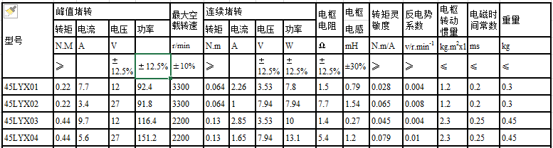 45LYX系列直流力矩電動機性能參數表